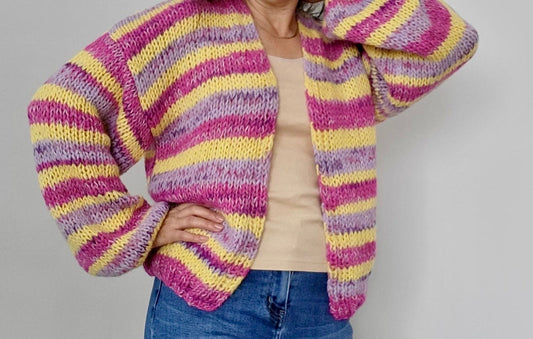 LISE Alpaca Mohair Cardigan, Relaxed Fit, Hand Knit, Striped Cardigan, Colourful Cardigan, Multicolor Cardigan, Violet & Yellow