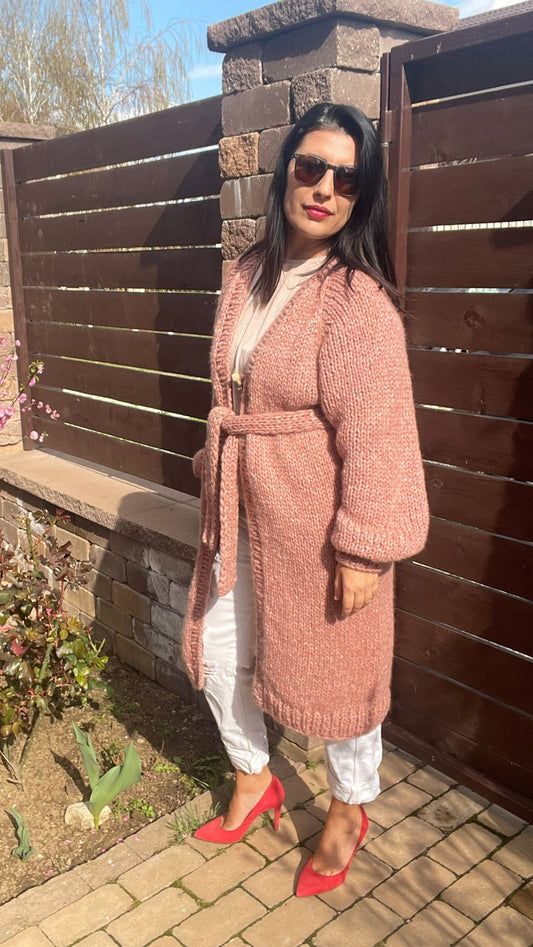 LARA Long Knit Cardigan with Belt, Pink Blush Cardigan, Alpaca Merino Long Coat, Long Knit Cardigan with Belt, Pastel Soft Alpaca Cardigan