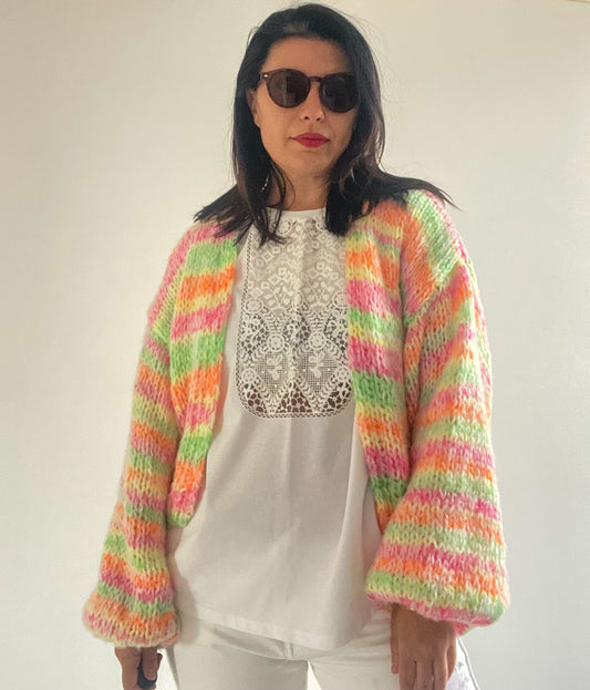 LEELA Alpaca Mohair Cardigan with Balloon Sleeves, Relaxed Fit, Hand Knit, Pastel Cardigan, Colourful Cardigan, Multicolor Cardigan